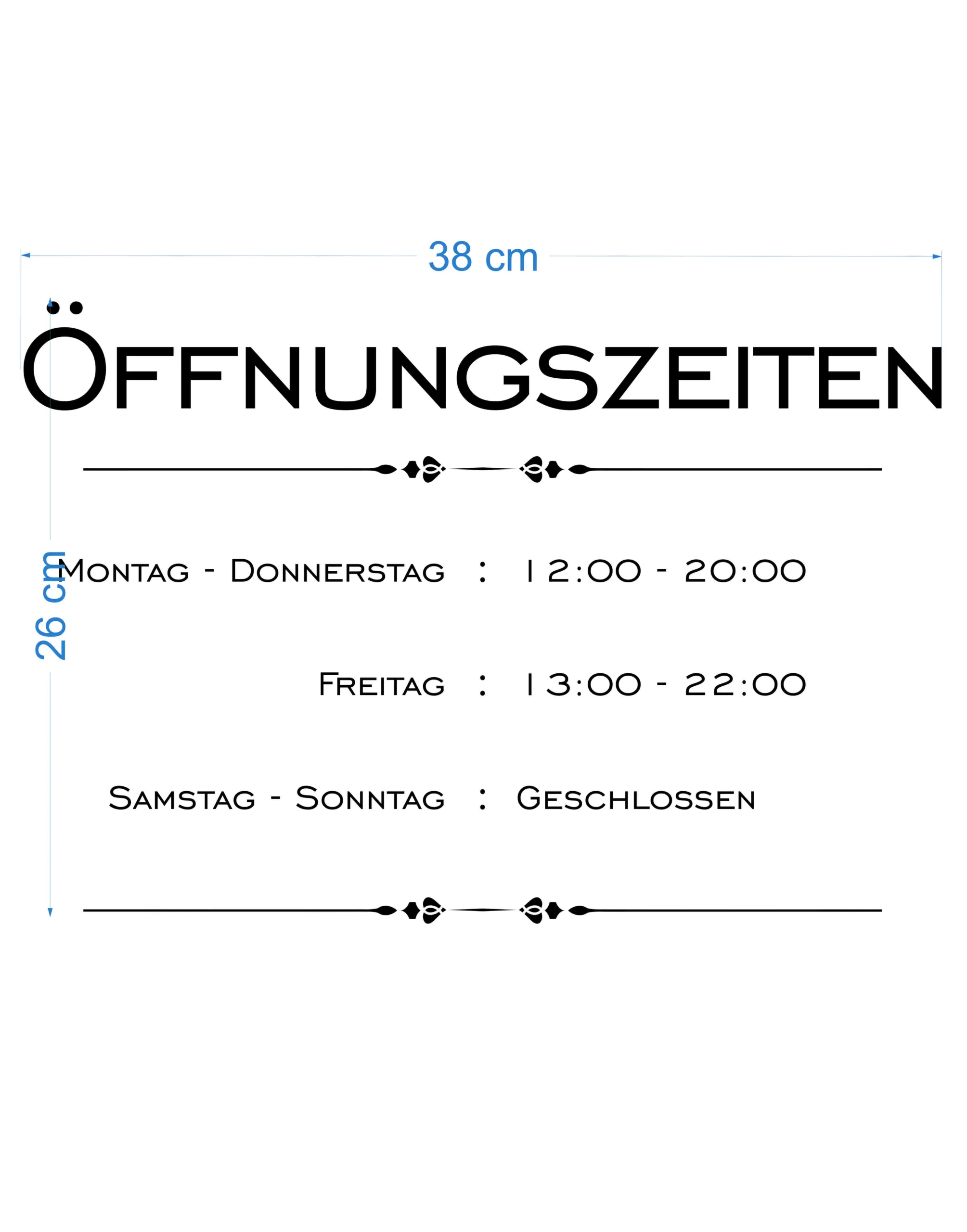 Präsentieren Sie Ihre Geschäftszeiten klar, stilvoll und professionell mit unserer hochwertigen Öffnungszeiten-Folienbeschriftung im fertigen Design. Sie müssen lediglich Ihre Öffnungszeiten in das vorgesehene Textfeld eintragen – das Layout ist bereits optimal gestaltet und sofort einsatzbereit.
